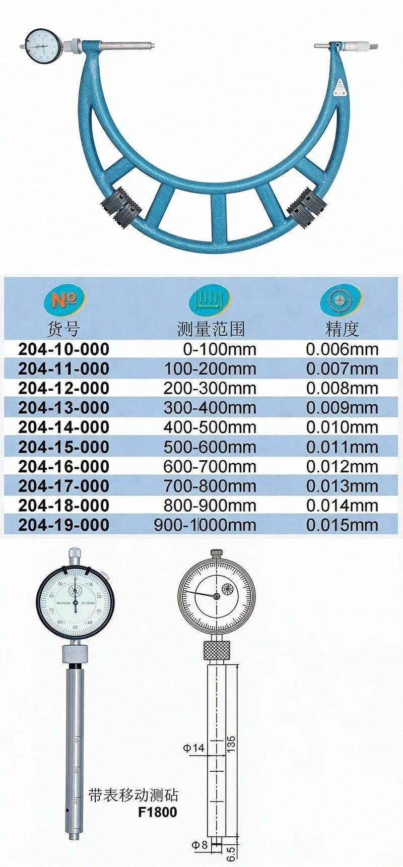 XIBEI(西北) 青量带表移动测砧外径,204-10-000 0-100*0.01mm、最大测力10N、量表行程5mm 售卖规格:1把