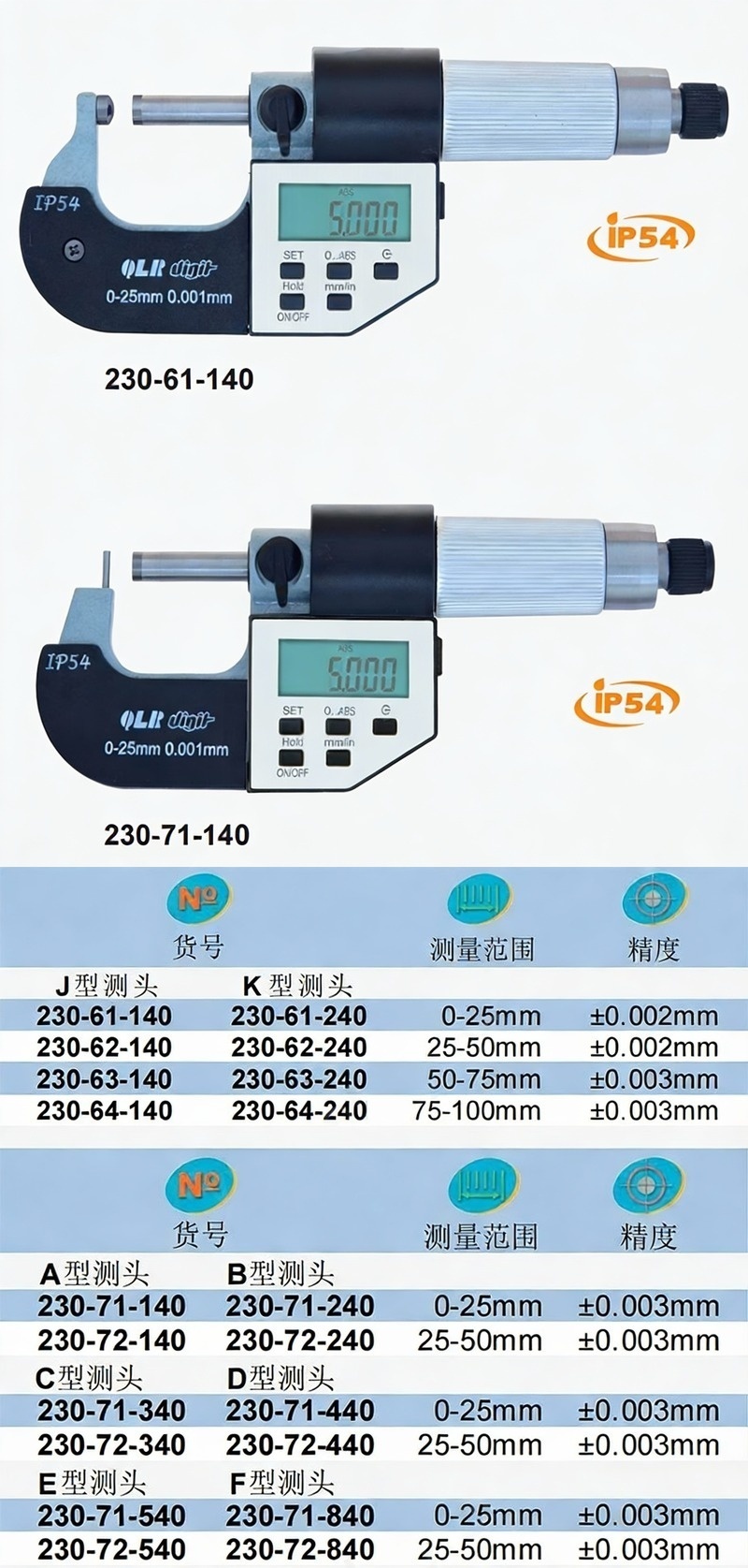 XIBEI(西北) 青量数显壁厚千分尺,230-71-240 0-25*0.001mm、B型(Φ3.5*8mm测砧)、五键、IP54 售卖规格:1把