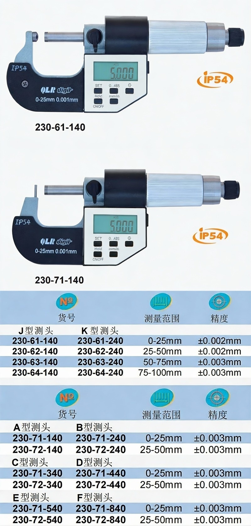 XIBEI(西北) 青量数显壁厚千分尺,230-71-540 0-25*0.001mm、E型(Φ8*27.5mm圆柱测砧)、五键、IP54 售卖规格:1把