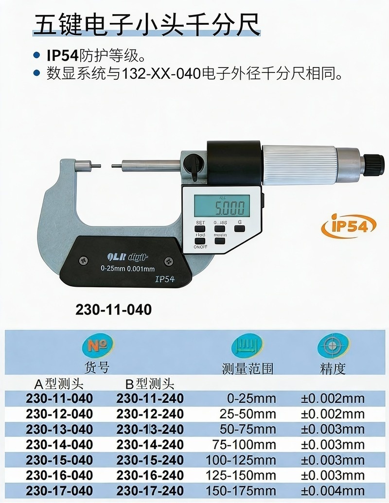 XIBEI(西北) 青量数显小头千分尺,230-15-240 100-125*0.01mm、B型(Φ3*10)、五键、IP54 售卖规格:1把