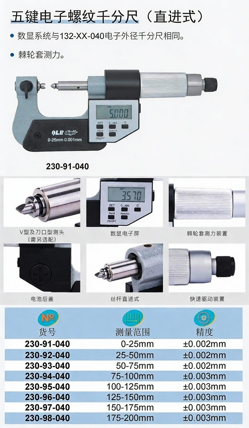 XIBEI(西北) 青量数显螺纹千分尺,230-93-040 50-75*0.001mm、直进式(不配测头)、五键、IP54 售卖规格:1把