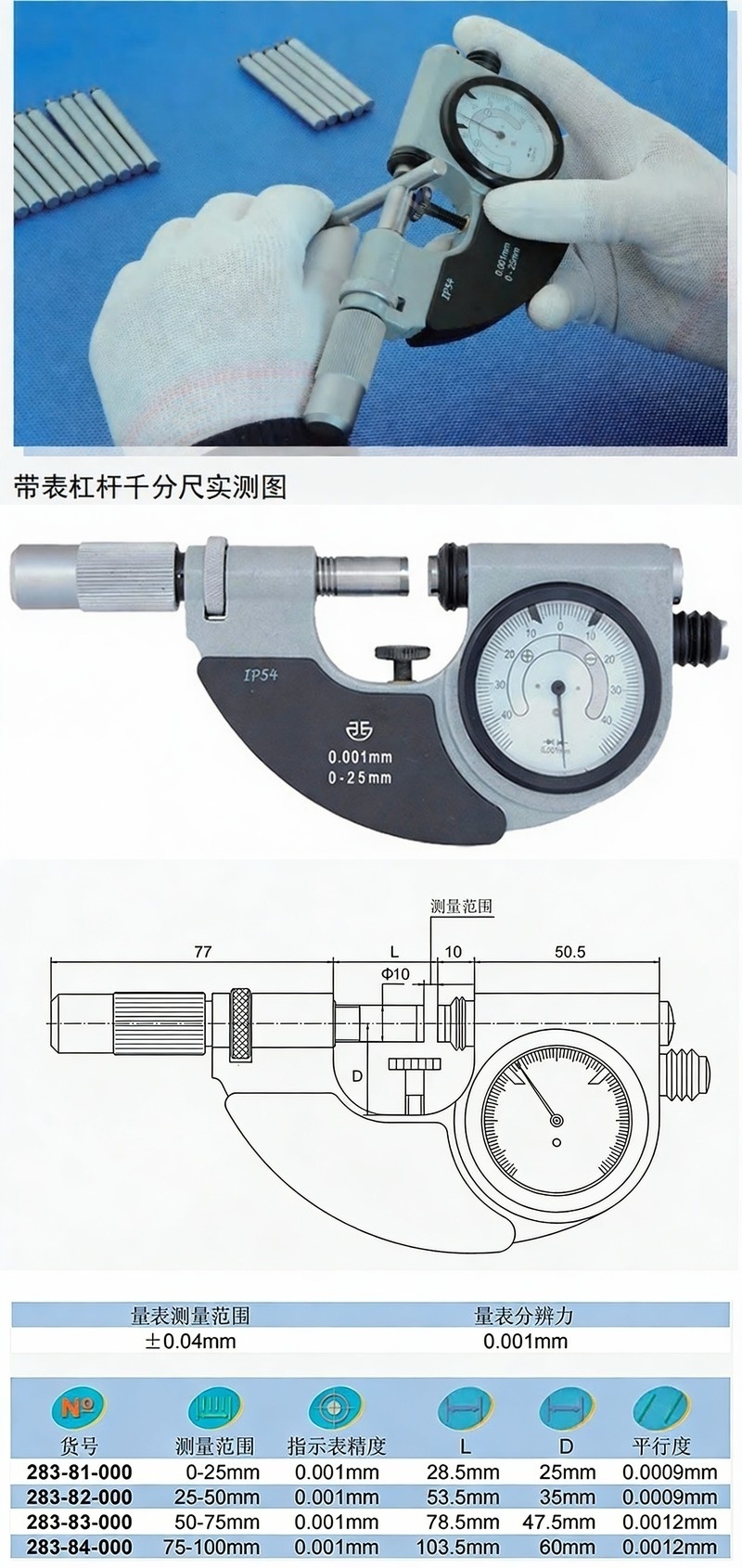 XIBEI(西北) 青量带表杠杆千分尺,283-84-000 75-100*0.001mm、Φ10硬质合金测量面、IP54 售卖规格:1把