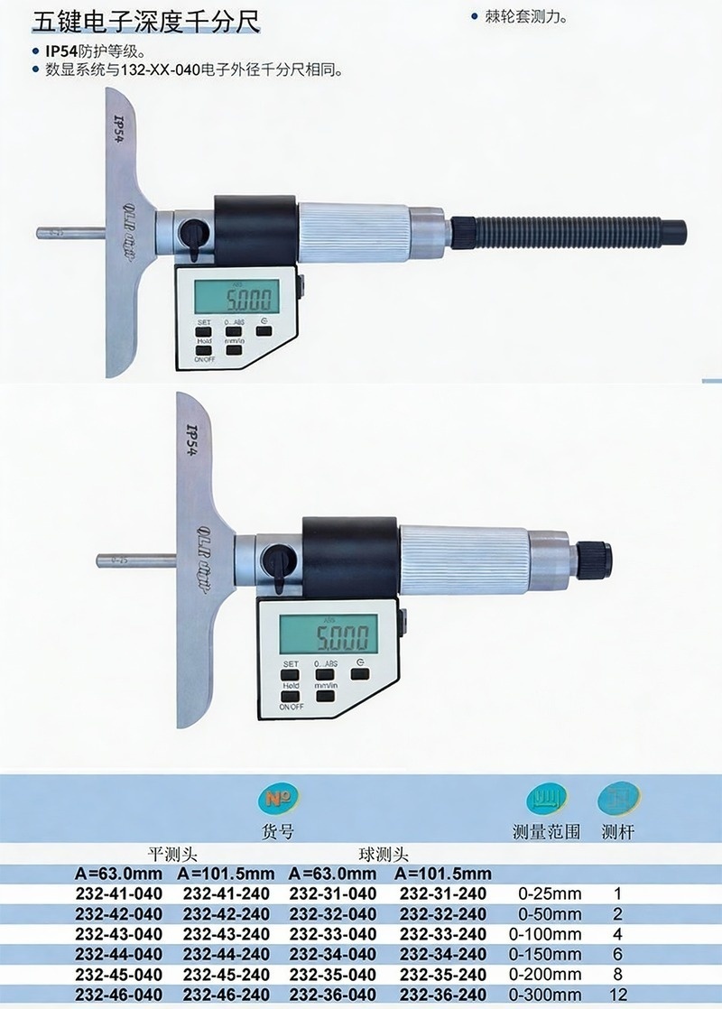 XIBEI(西北) 青量五键电子深度千分尺,232-41-040 0-25*0.001mm、平头、基座宽63、五键、IP54 售卖规格:1把