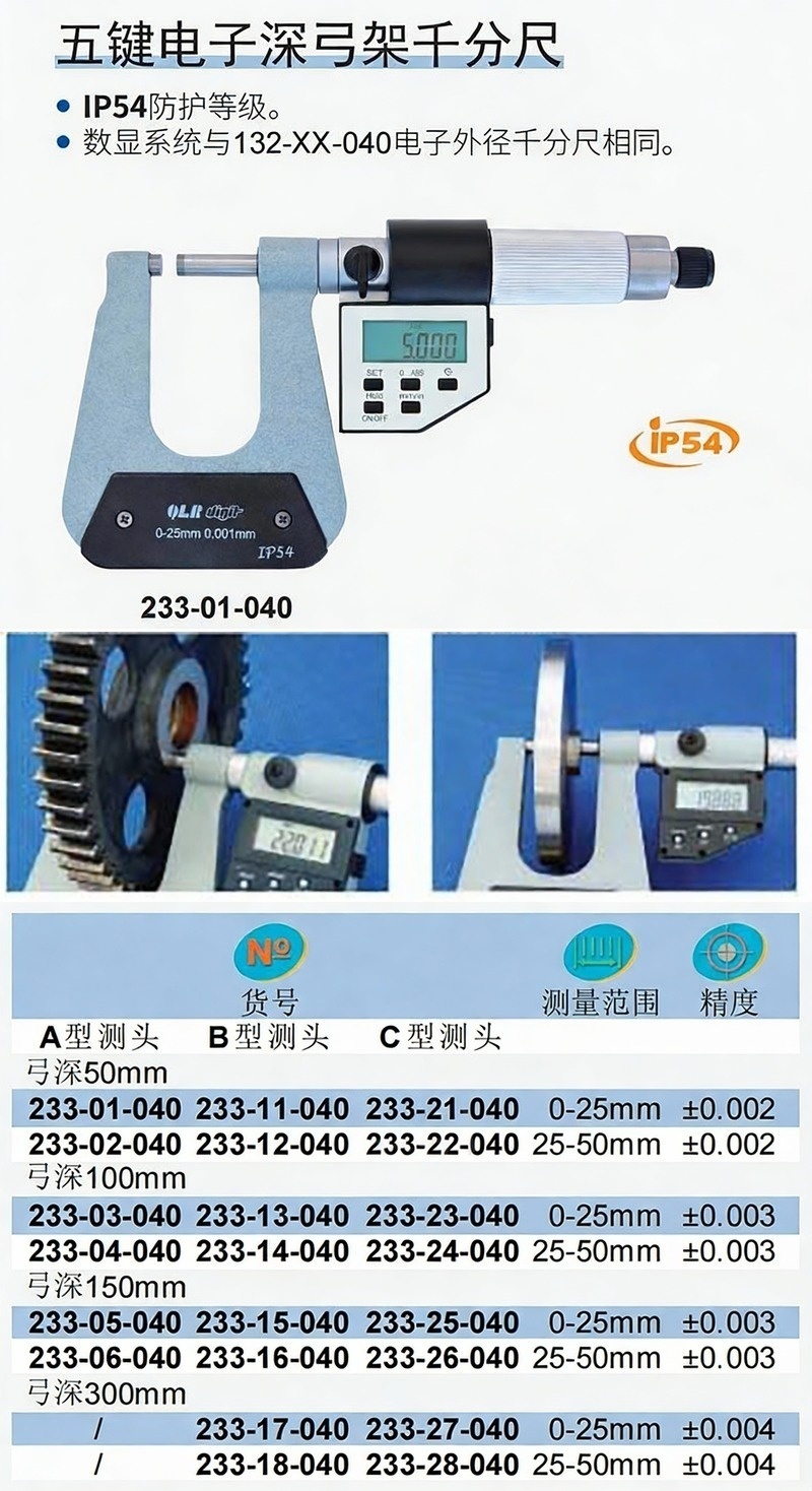 XIBEI(西北) 青量数显深弓架千分尺,233-28-040 25-50*0.001mm*300、C型(双球面SR5)、五键、IP54 售卖规格:1把