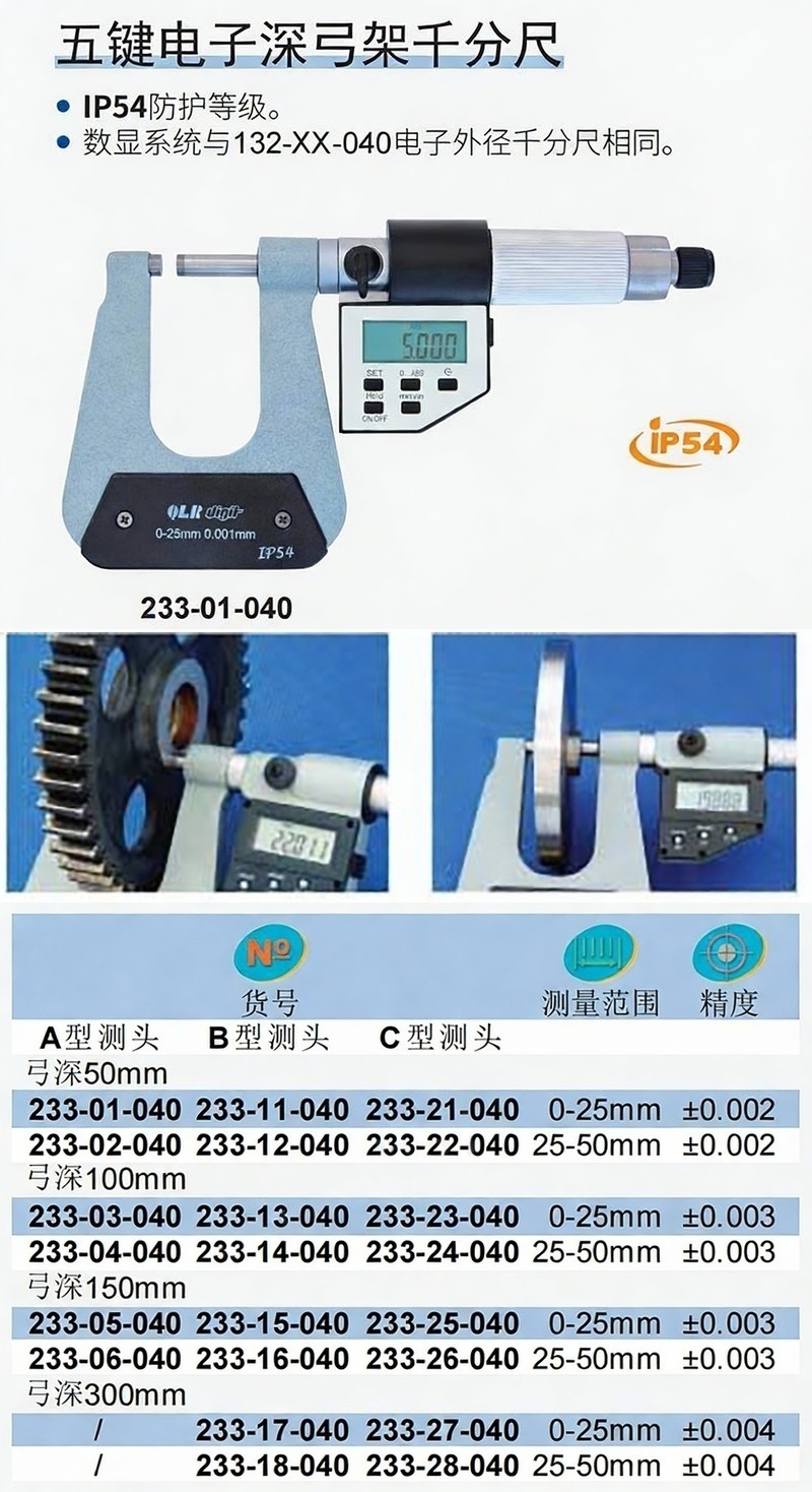 XIBEI(西北) 青量数显深弓架千分尺,233-14-040 25-50*0.001mm*100、B型(单球面SR5)、五键、IP54 售卖规格:1把