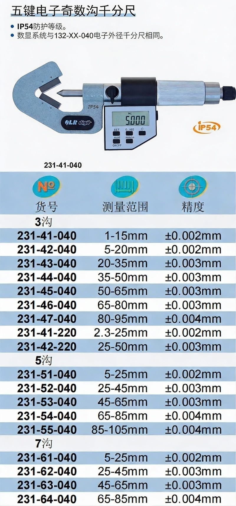 XIBEI(西北) 青量数显三沟千分尺,231-47-040 80-95*0.001mm、60°测砧、五键、IP54 售卖规格:1把