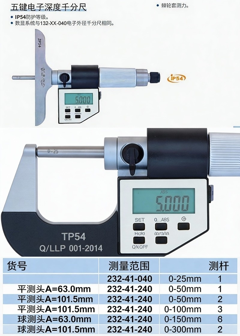 XIBEI(西北) 青量五键电子深度千分尺,232-45-040 0-200*0.001mm、平头、基座宽63、五键、IP54 售卖规格:1把
