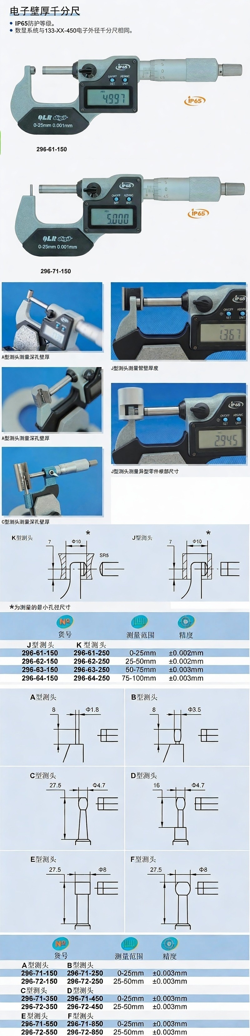 XIBEI(西北) 青量数显壁厚千分尺,296-72-550 25-50*0.001mm、E型(Φ8*27.5mm圆柱测砧)、电子/刻度显示、IP65 售卖规格:1把