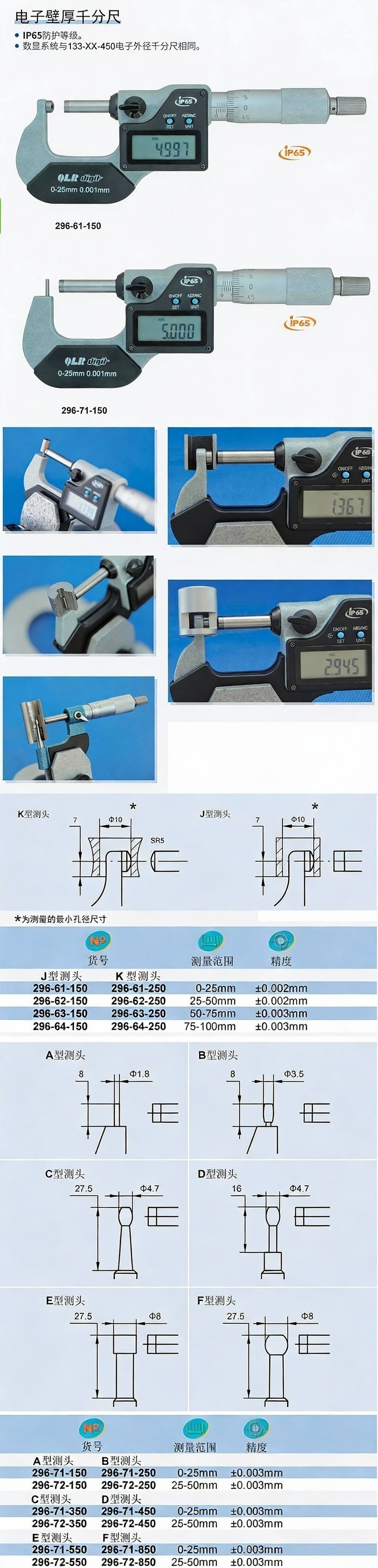 XIBEI(西北) 青量数显壁厚千分尺,296-71-450 0-25*0.001mm、D型(Φ4.7*16mm测砧)、电子/刻度显示、IP65 售卖规格:1把