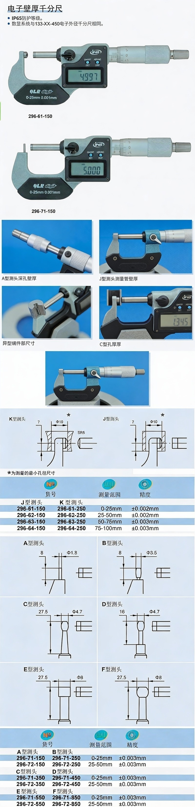 XIBEI(西北) 青量数显壁厚千分尺,296-72-150 25-50*0.001mm、A型(Φ1.8*8mm测砧)、电子/刻度显示、IP65 售卖规格:1把