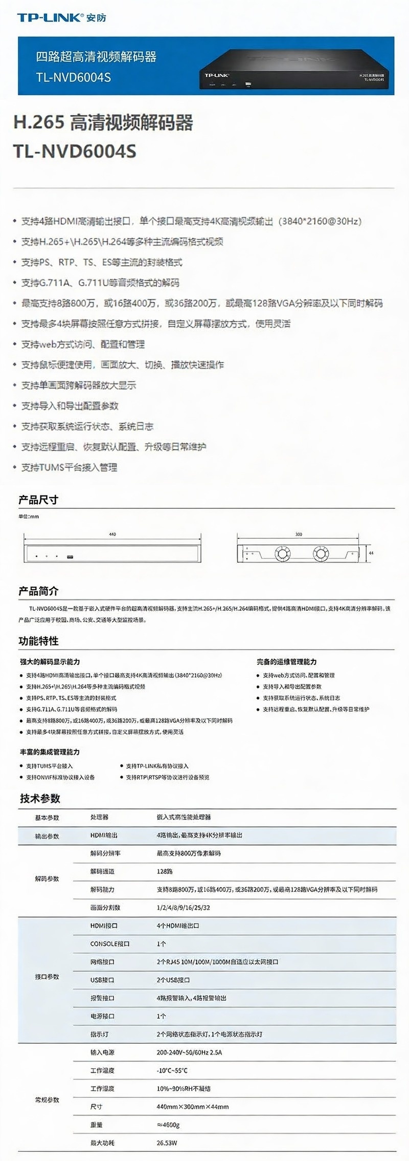 普联/TP-LINK 4路H.265高清视频解码器,TL-NVD6004S 1台