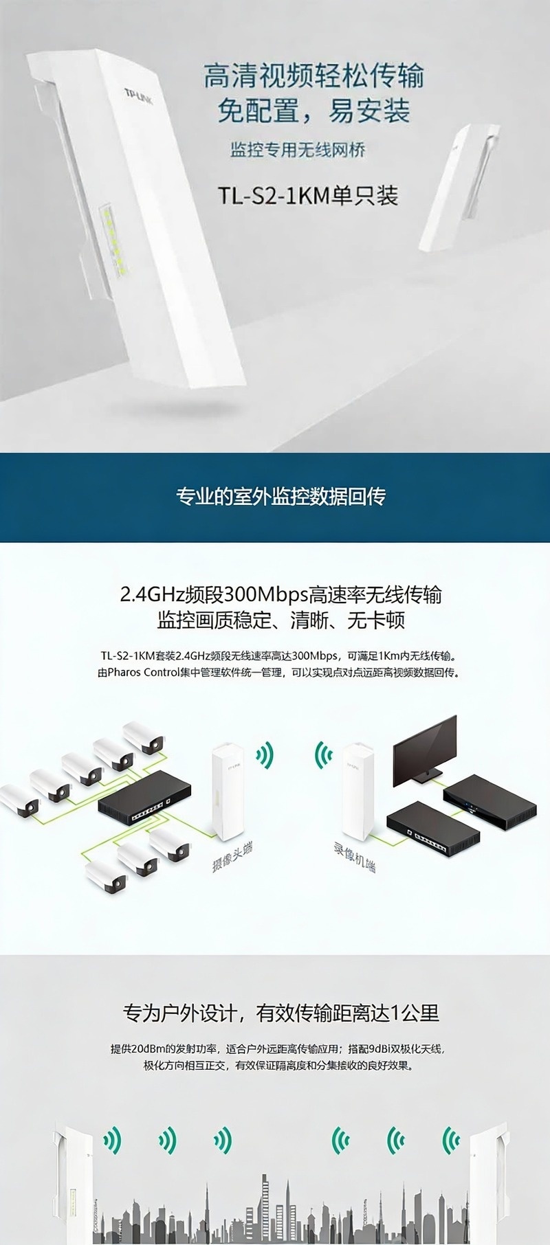 普联/TP-LINK 2.4GHz监控专用无线网桥(1公里),TL-S2-1KM (单个) 1台