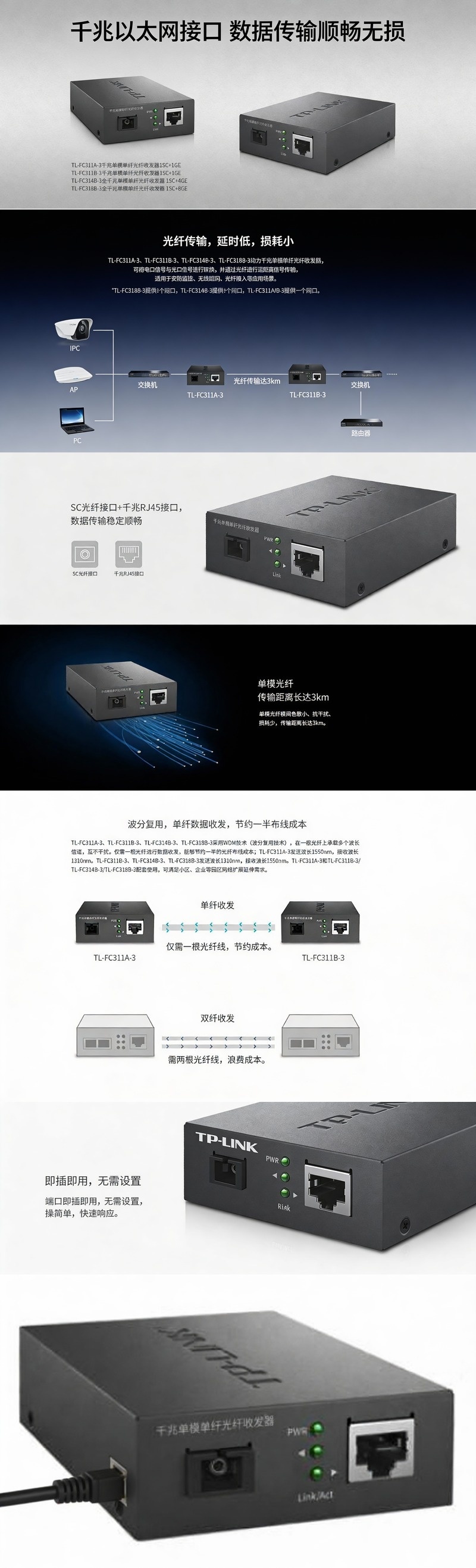 普联/TP-LINK 千兆单模单纤光纤收发器,TL-FC311A-3+TL-FC311B-3 套装 1个