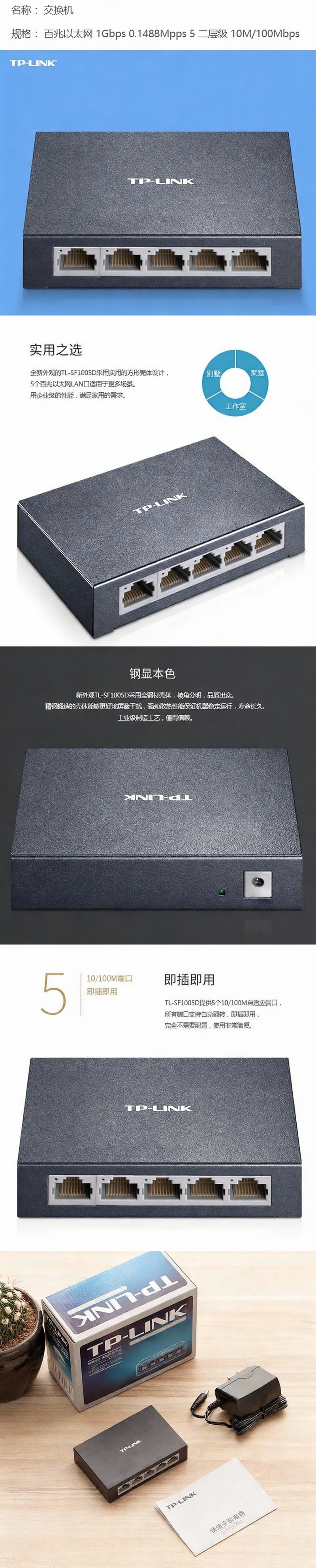 普联/TP-LINK 交换机,SF1005D 5口百兆交换机 铁壳桌面型 1个
