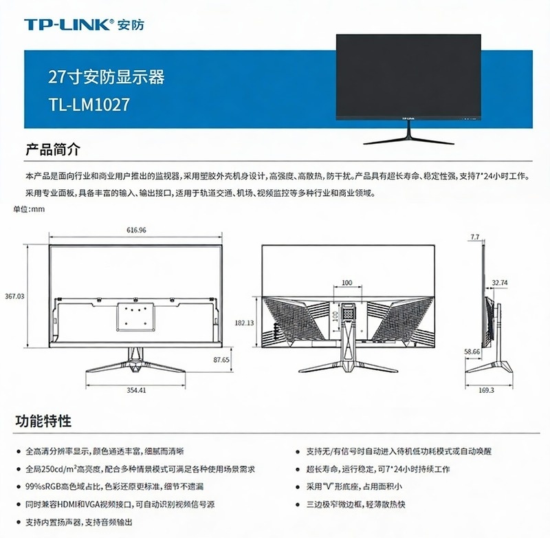 普联/TP-LINK 27英寸安防监视器显示器,TL-LM1027 1个