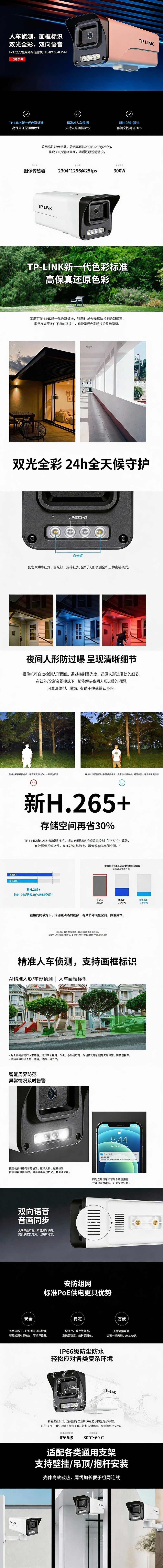 普联/TP-LINK 300万H.265双光警戒双向语音筒形摄像机,TL-IPC534EP-AI4 POE供电 1个