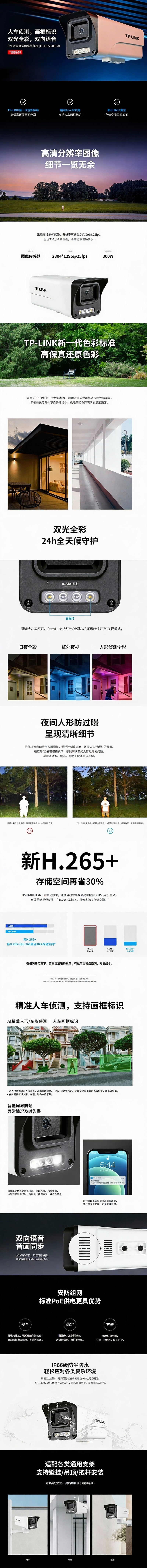普联/TP-LINK 300万H.265双光警戒双向语音筒形摄像机,TL-IPC534EP-AI6 POE供电 1个