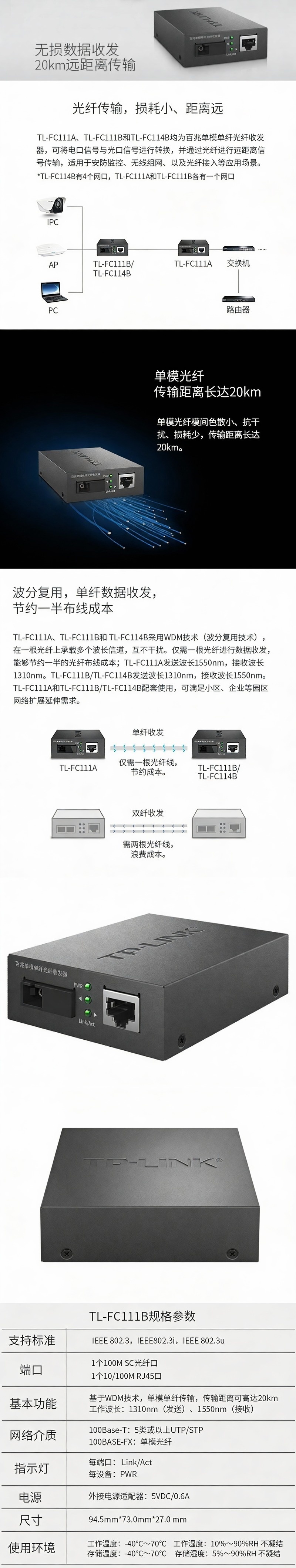 普联/TP-LINK 百兆单模单纤光纤收发器,TL-FC111B TL-FC111B需与TL-FC111A配对 1个