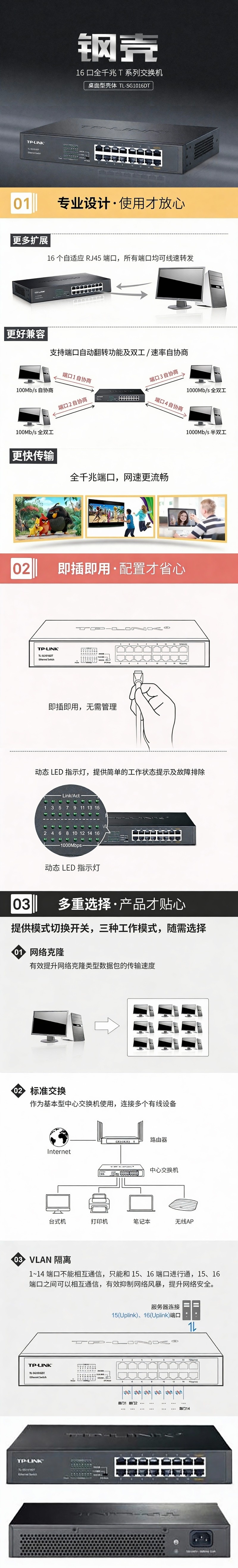 普联/TP-LINK 交换机,SG1016DT 16口千兆交换机 非网管T系列 1个