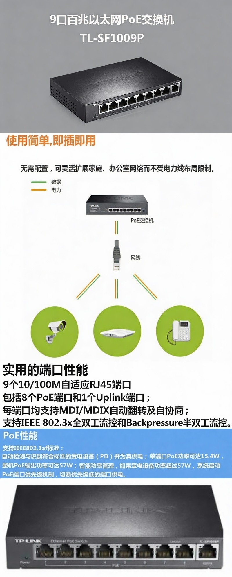 普联/TP-LINK 交换机,SF1009P 9口百兆8口POE非网管PoE交换机 1个
