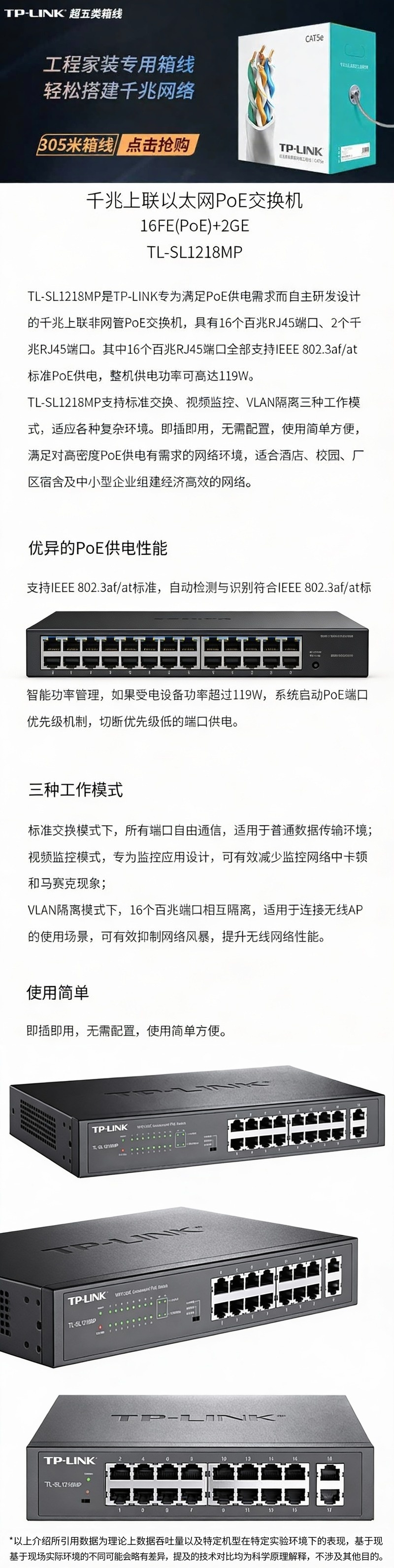 普联/TP-LINK 交换机,TL-SL1218MP 16FE POE+2GE 千兆上联非网管POE交换机 桌面机架 1台