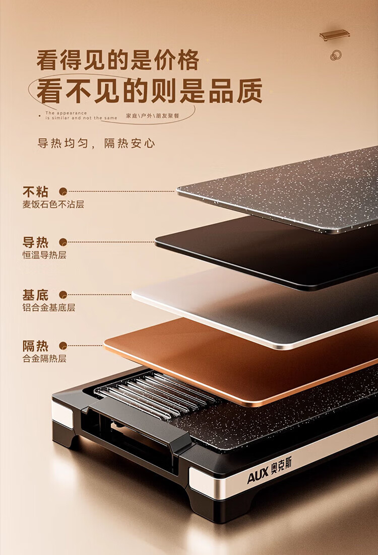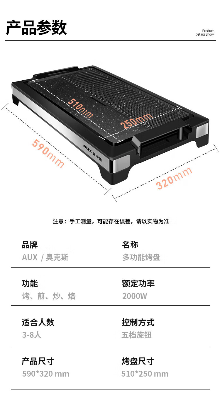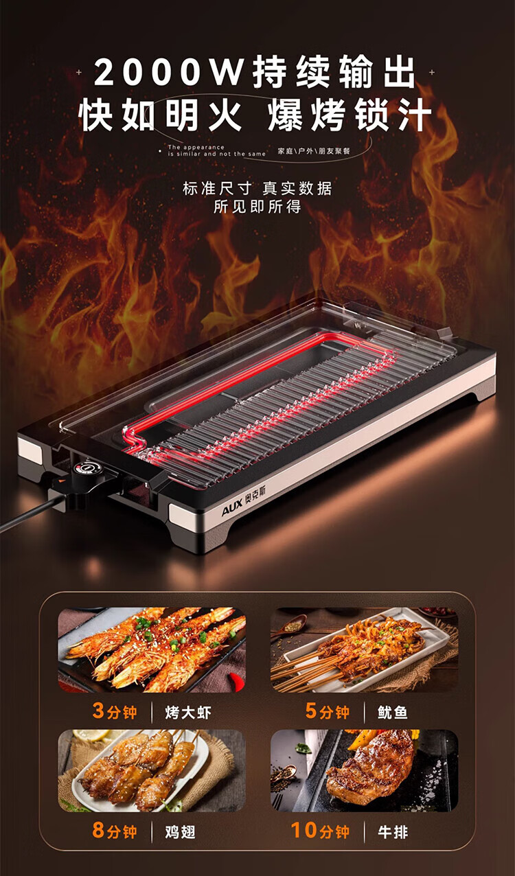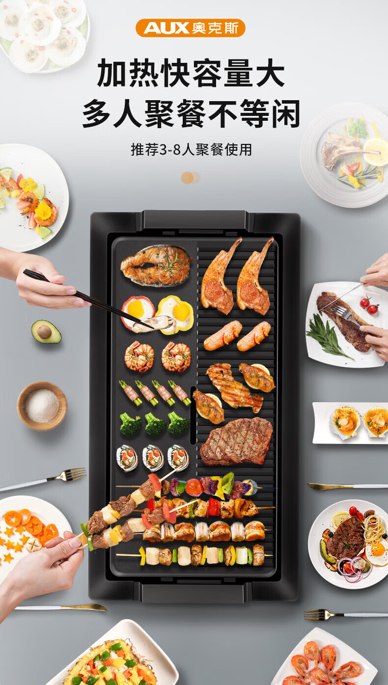 奥克斯(AUX) 烤肉锅烧烤炉电烤盘家用室内多功能料理锅不粘无烟韩式烤羊肉串机 加大号烤盘-大火力-可拆洗LA-155G