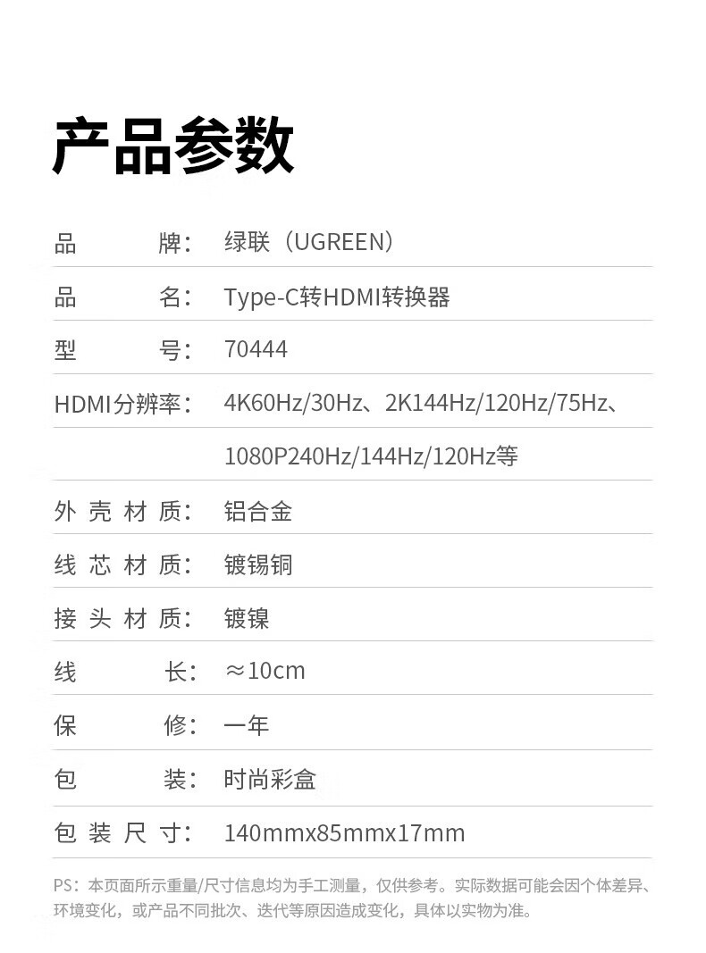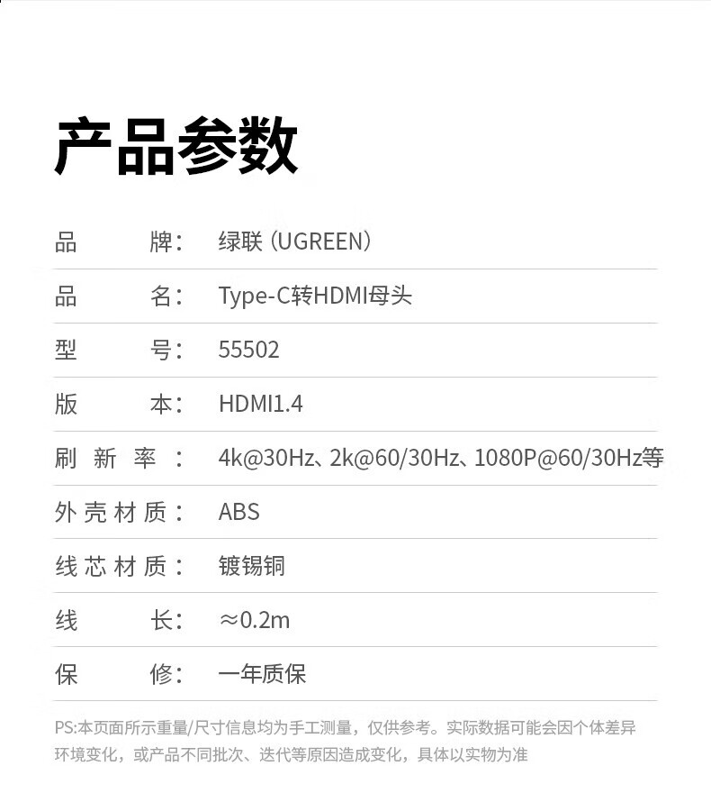 绿联TypeC转HDMI母头 转接器 4K/30Hz 0.2米黑色 55502