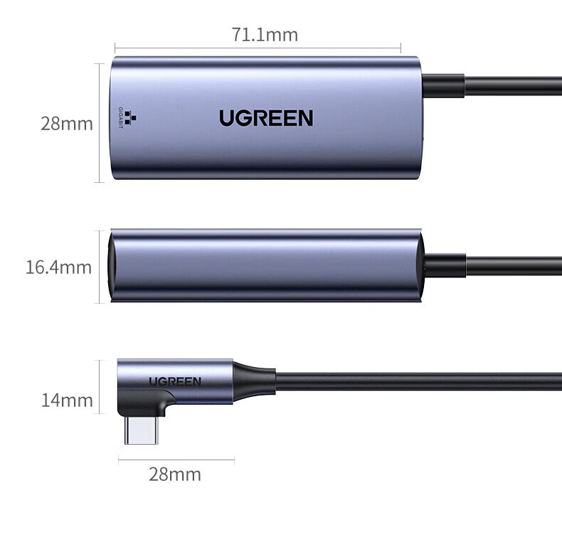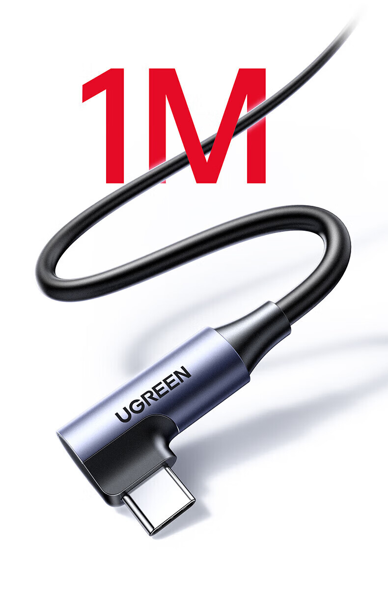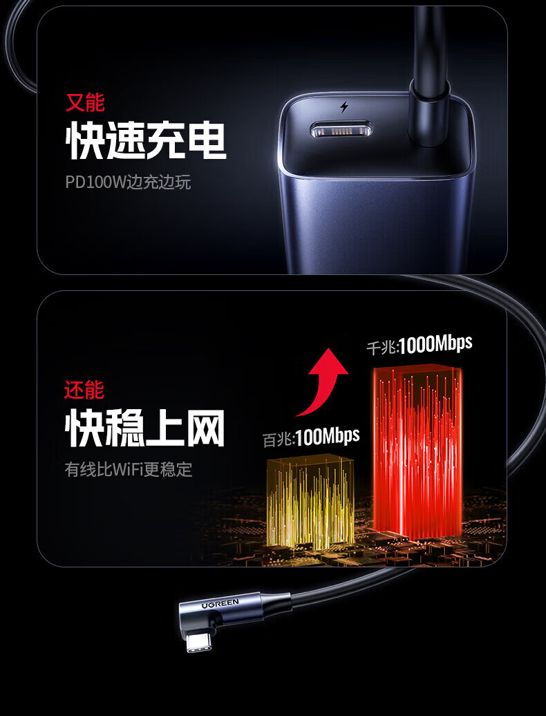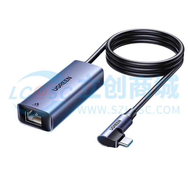 绿联Type-C转RJ45+PD充电口 千兆网卡转换器 长线弯头款 1米 65729