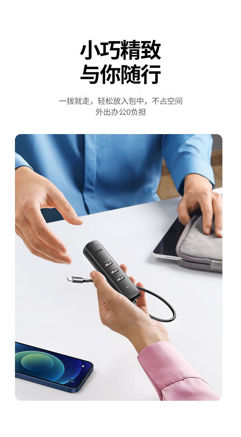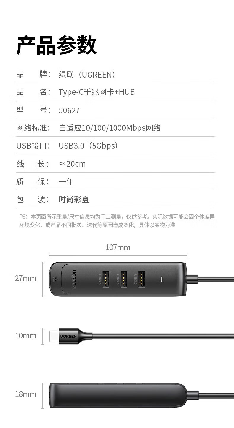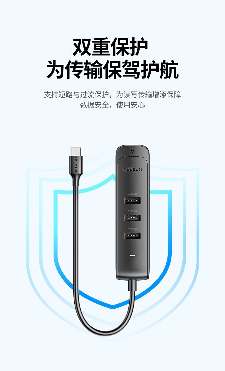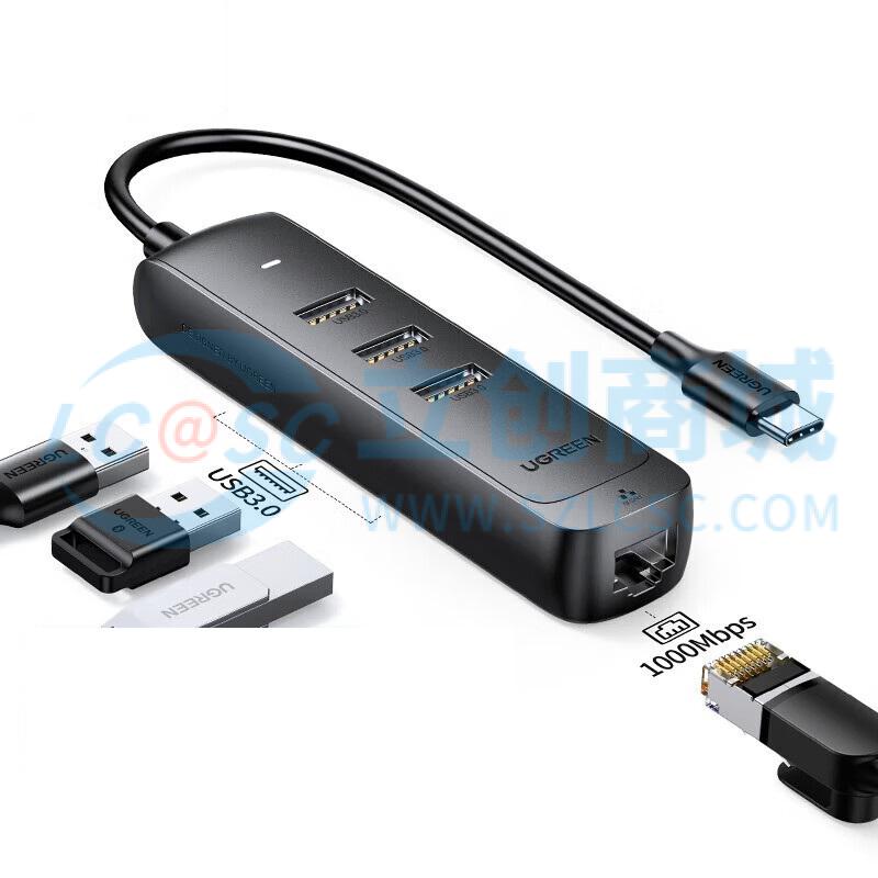 绿联Type-C转3*USB 3.0+RJ45(千兆)集线器 黑色 50627