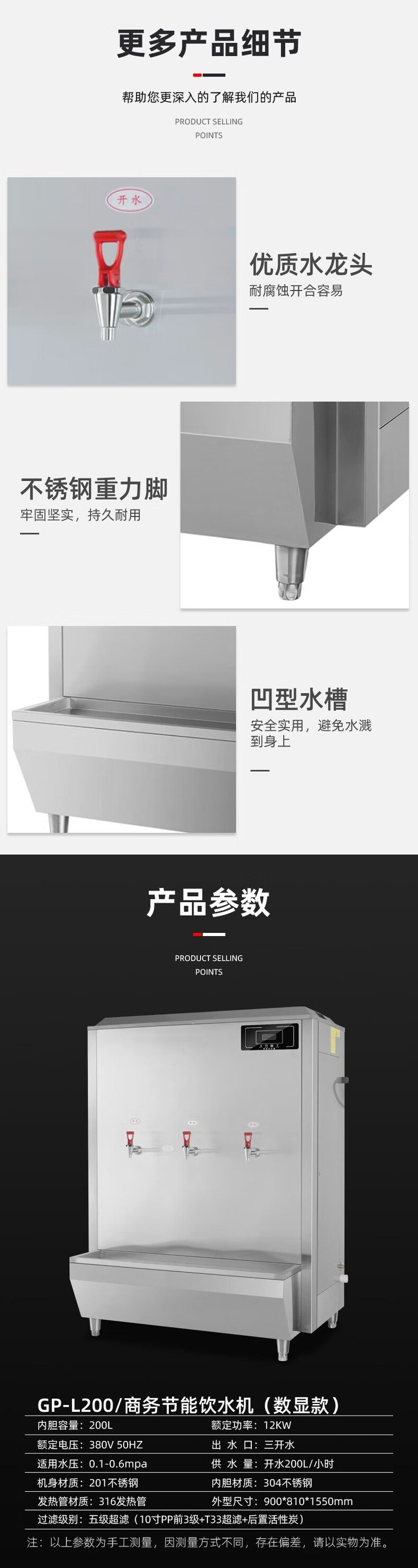 Stevison(史蒂芬) GP-L200 商务节能饮水机(数显款) 容量200L 电压380V 功率12KW 五级RO返渗透过滤 三开水 不锈钢