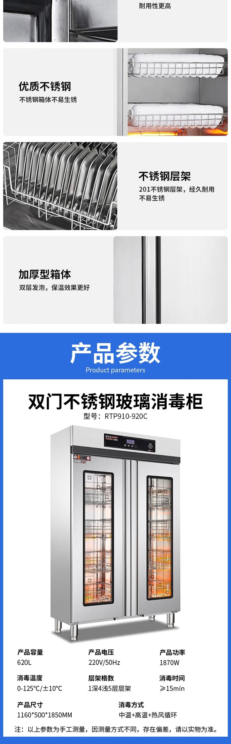 Stevison(史蒂芬) RTP910-920C 双门不锈钢玻璃高温消毒柜,高低温可调 商用热风循环 多功能消毒碗柜单位食堂大容量碗筷餐具消毒柜双门 定时定温 不锈钢+玻璃