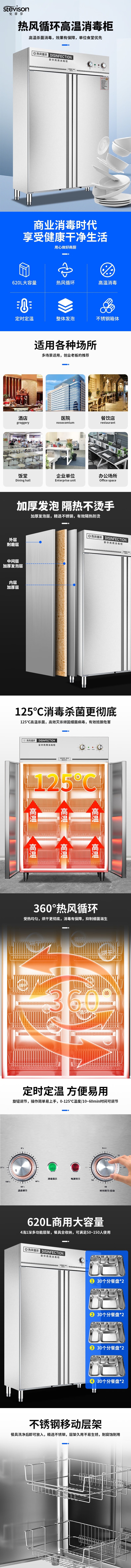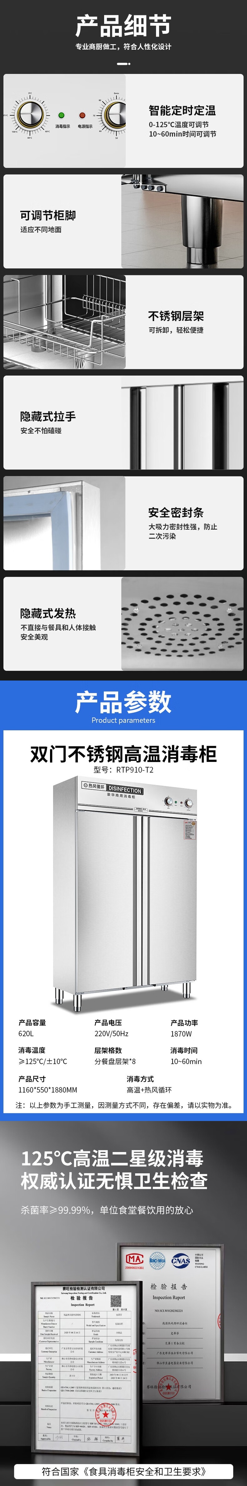 Stevison(史蒂芬) RTP910-T2 双门不锈钢高温消毒柜 单位食堂餐厅饭店不锈钢多功能餐具消毒柜立式大容量双开门高温热风循环烘干定时定温 二星级 不锈钢