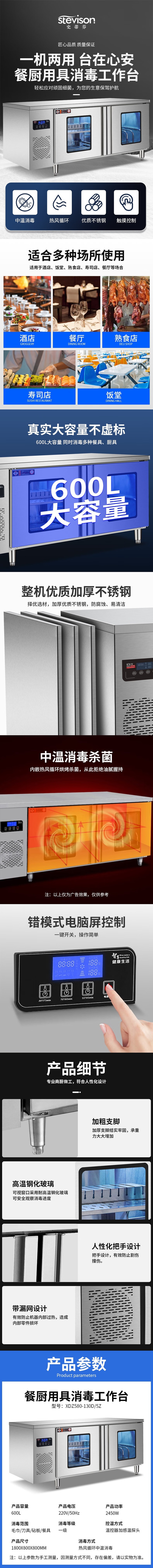 Stevison(史蒂芬) XDZ580-130D/5Z 消毒柜工作台 不锈钢加钢化玻璃透窗柜门 平板式层架 触摸式电脑屏控制 热风循环中温消毒 可消毒密胺餐具 不锈钢+玻璃