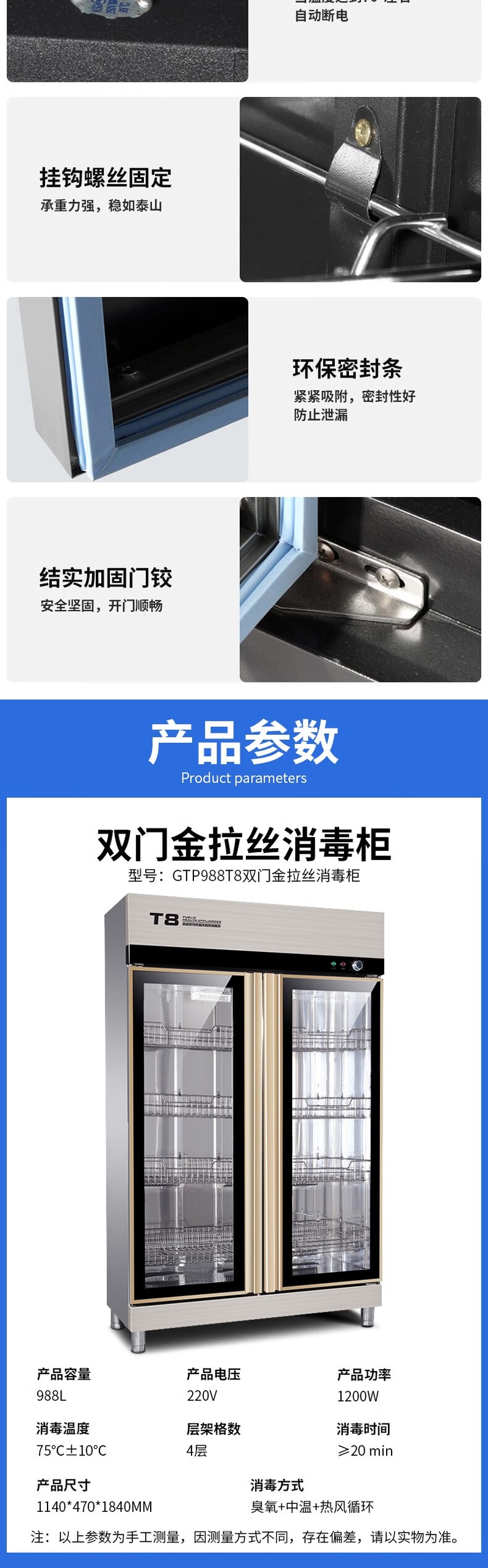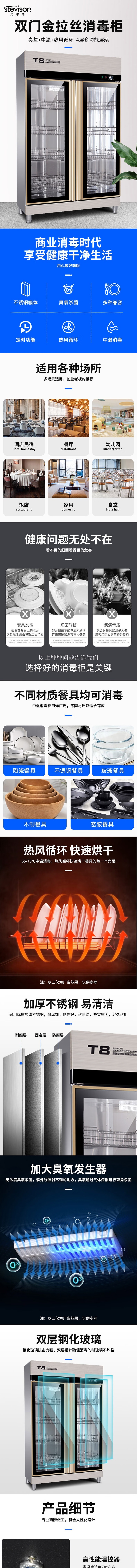 Stevison(史蒂芬) SDF-GTP988T8 双门金拉丝消毒柜 大容量988L 220V 臭氧+中温热风循环系统,双重保护装置 机械旋钮定时控制 不锈钢+玻璃