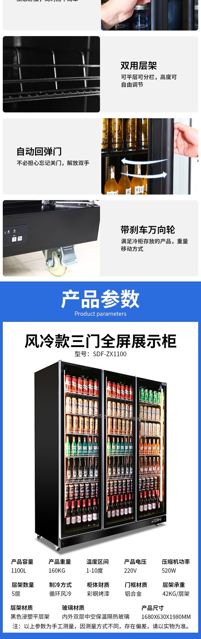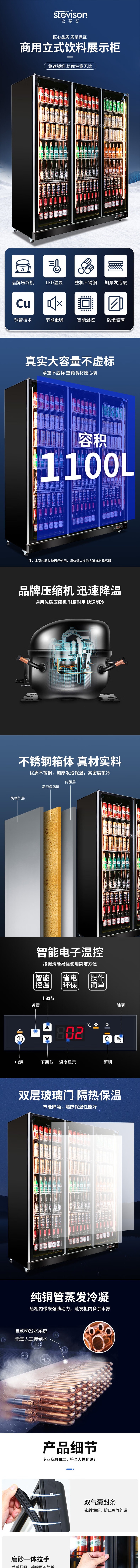 Stevison(史蒂芬) SDF-ZX1100 高端风冷款三门全屏展示柜 饮料酒水蔬菜展示柜陈列柜220V 1100L 彩钢烤漆