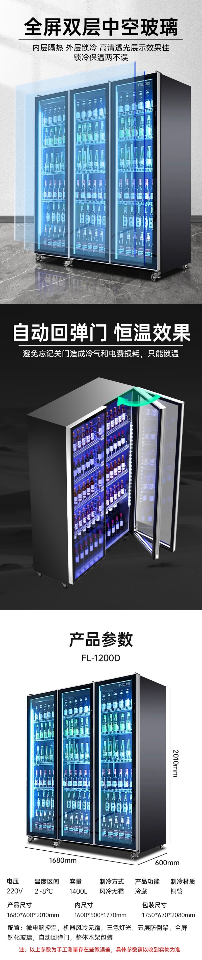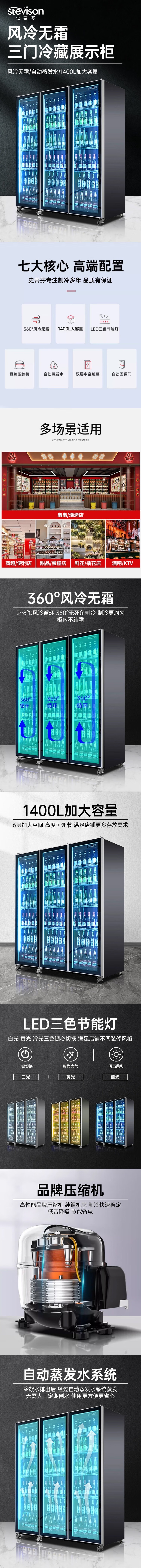Stevison(史蒂芬) FL-1200D 三门展示柜 酒水柜 饮料柜容量1400L 电压220V 功率380W 全冷藏 风冷款 家电镀锌喷涂漆+玻璃