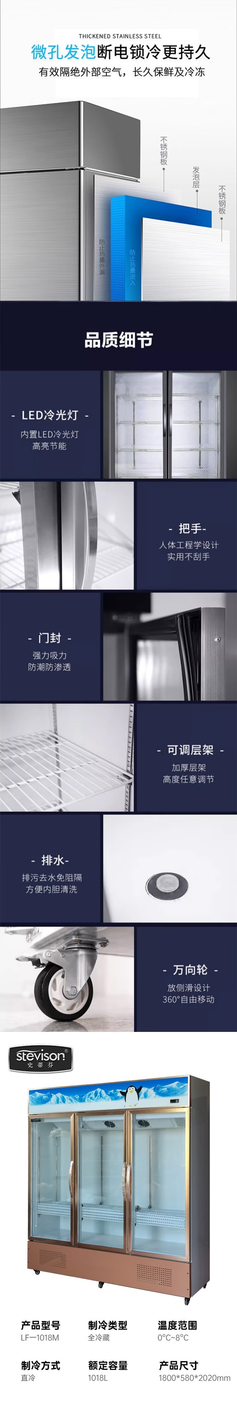Stevison(史蒂芬) LF-1018M 三门展示柜 容量1010L 电压220V 功率230W 全冷藏 直冷款 家电镀锌喷涂漆+玻璃