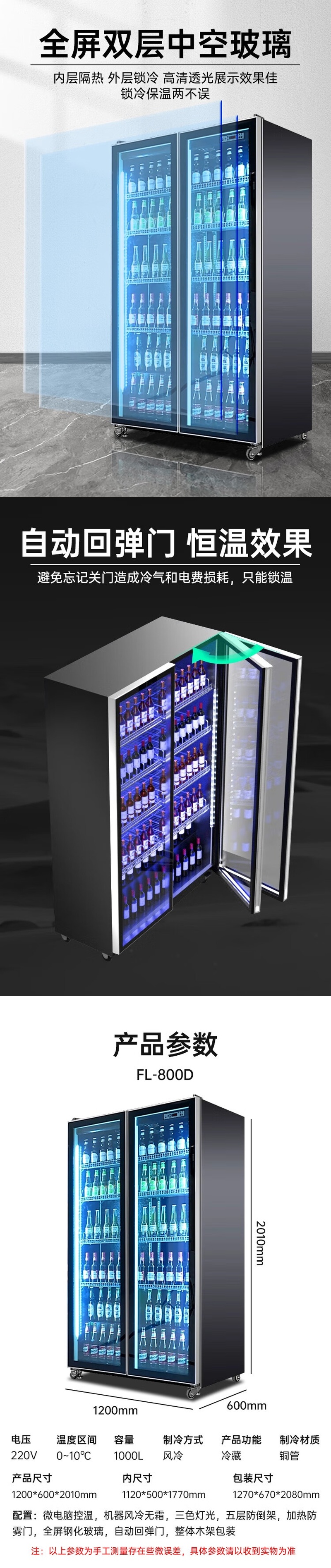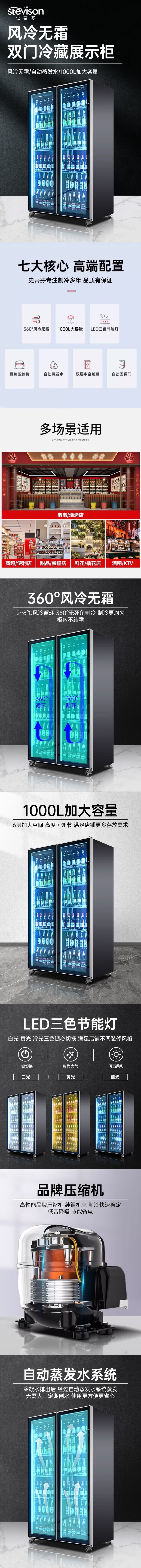 Stevison(史蒂芬) FL-800D 双门展示柜 酒水柜 饮料柜容量1000L 电压220V 功率280W 全冷藏 风冷款 家电镀锌喷涂漆+玻璃