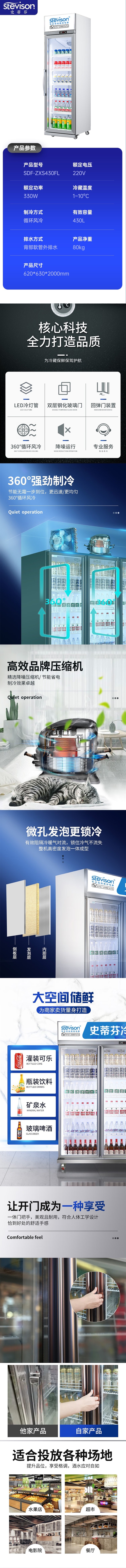 Stevison(史蒂芬) SDF-ZXS430FL 豪华风冷款单门玻璃展示柜 容量:430L,制冷方式:循环风冷+自动化霜,全冷藏 彩钢烤漆+银色