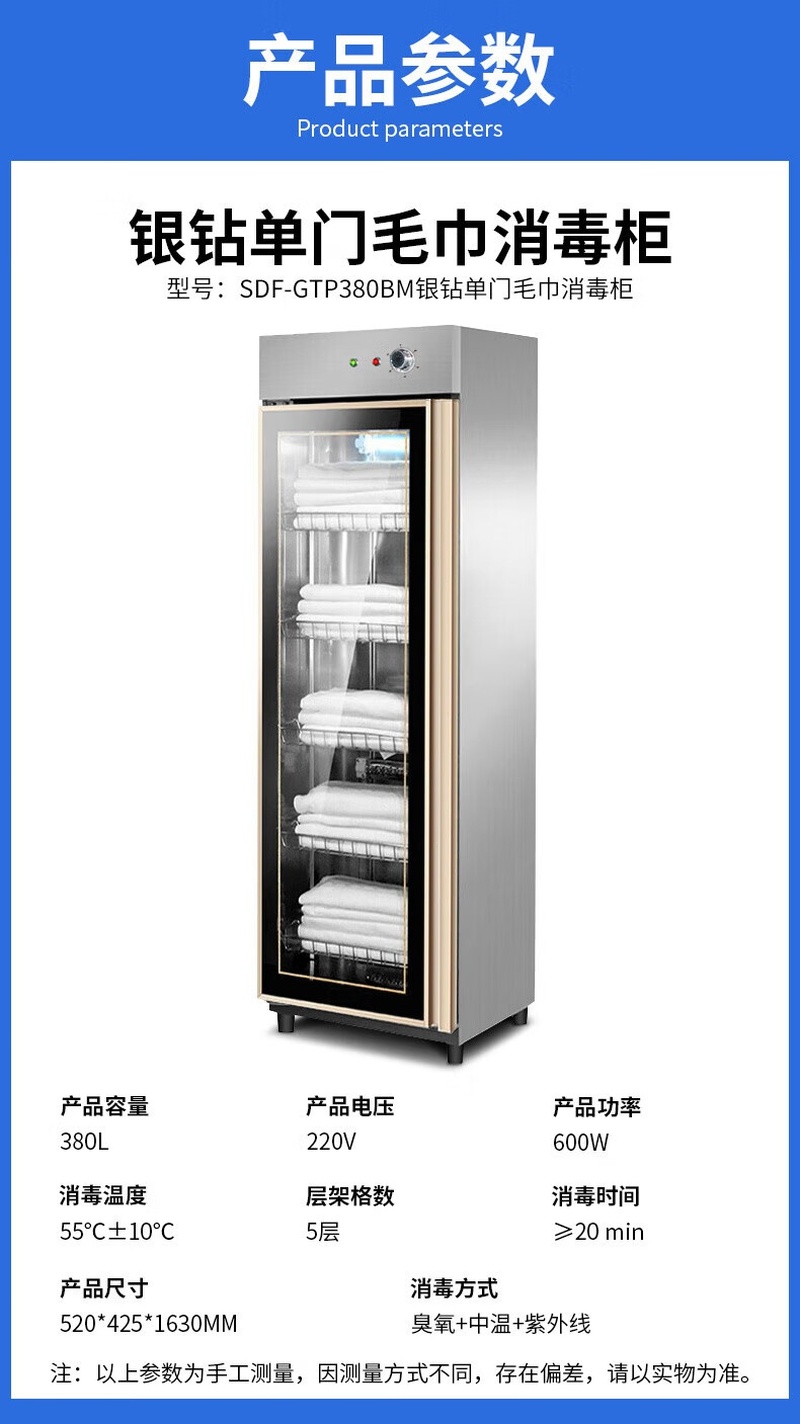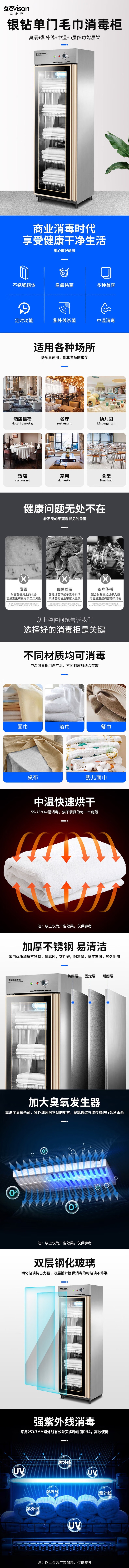 Stevison(史蒂芬) SDF-GTP380BM 银钻单门毛巾消毒柜 容量380L 220V 紫外线消毒 5个电镀层架 机械款定时开关 不锈钢+玻璃