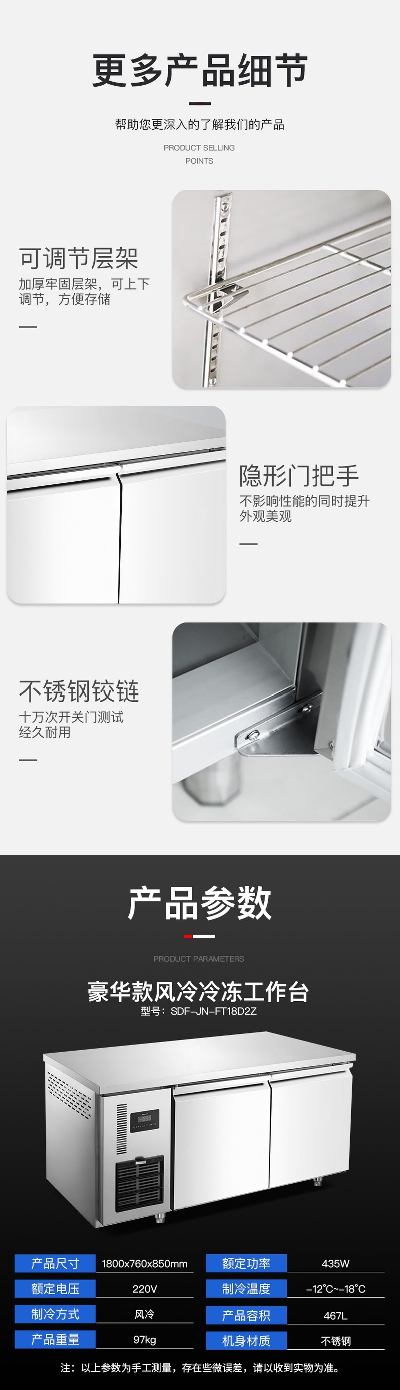 Stevison(史蒂芬) SDF-JN-FT18D2Z 豪华风冷款冷柜工作台1.8米(全冷冻) 风冷无霜工作台操作台冰柜平台雪柜水吧台后厨餐厅奶茶店节能环保智能温控高效锁鲜 不锈钢