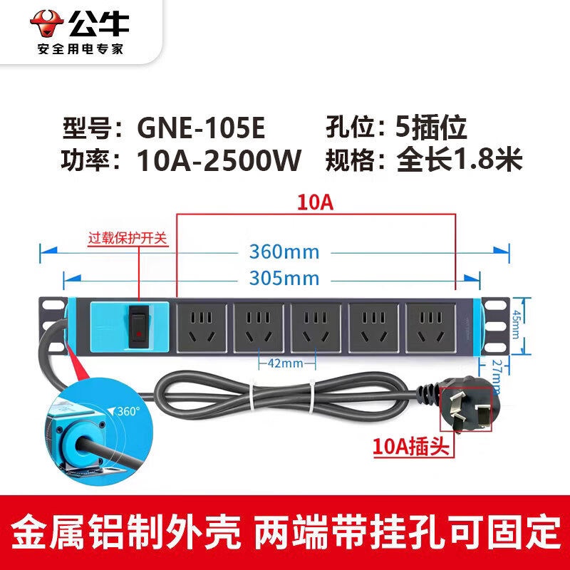 公牛PDU机柜插座10A 5位总控排插1.8米 过载保护 GNE-105E 盒装灰