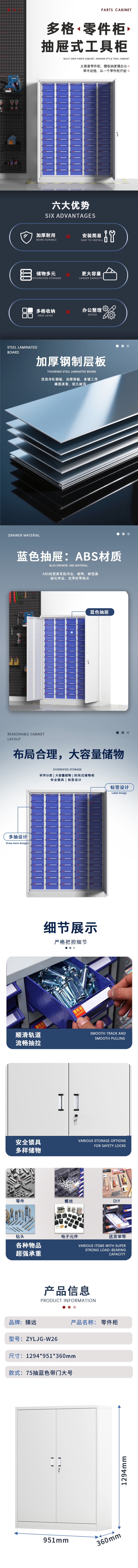 臻远 ZYLJG-W26 零件柜抽屉式工具柜电子元件柜螺丝柜样品柜物料柜 75抽蓝色带门大号