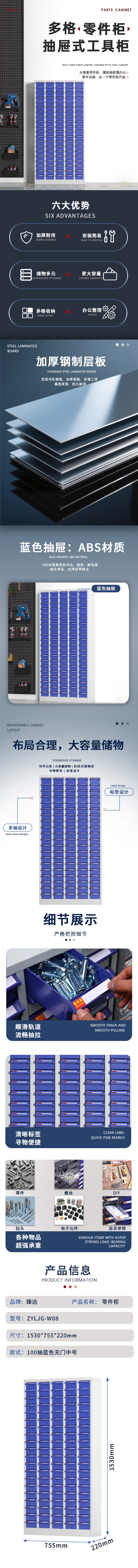 臻远 ZYLJG-W08 零件柜抽屉式工具柜电子元件柜螺丝柜样品柜物料柜 100抽蓝色无门中号