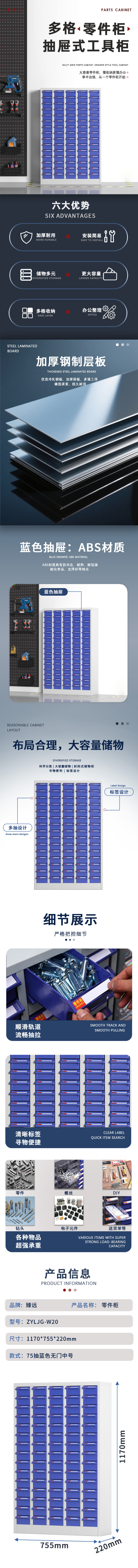 臻远 ZYLJG-W20 零件柜抽屉式工具柜电子元件柜螺丝柜样品柜物料柜 75抽蓝色无门中号