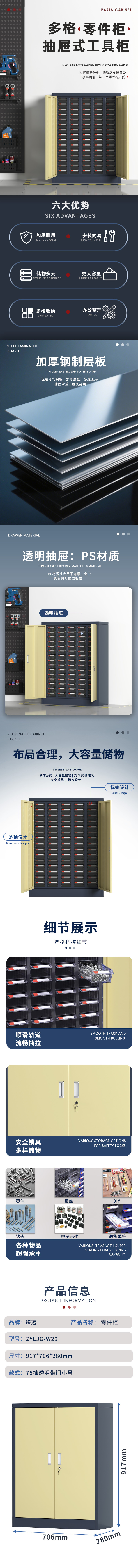 臻远 ZYLJG-W29 零件柜抽屉式工具柜电子元件柜螺丝柜样品柜物料柜 75抽透明带门小号