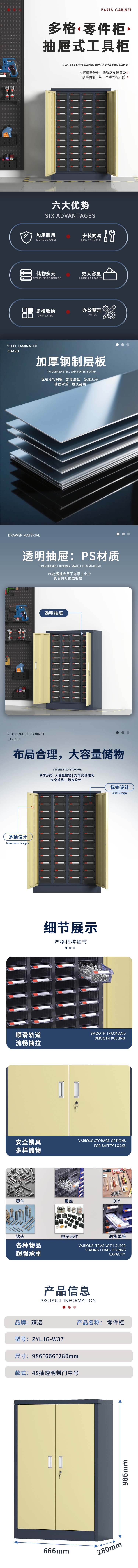 臻远 ZYLJG-W37 零件柜抽屉式工具柜电子元件柜螺丝柜样品柜物料柜 48抽透明带门中号