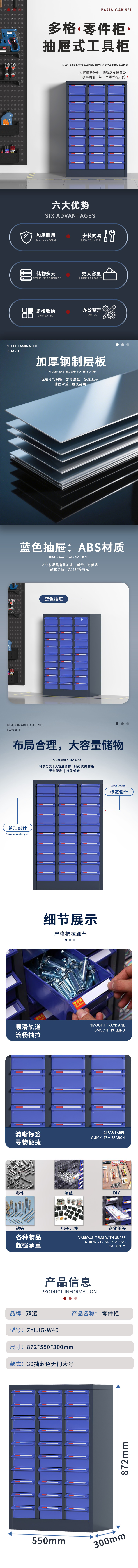 臻远 ZYLJG-W40 零件柜抽屉式工具柜电子元件柜螺丝柜样品柜物料柜 30抽蓝色无门大号