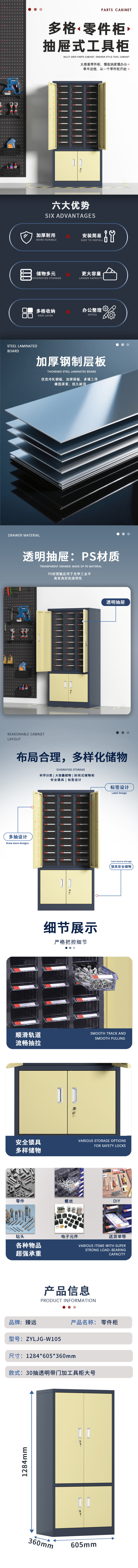 臻远 ZYLJG-W105 零件柜抽屉式工具柜电子元件柜螺丝柜物料柜30抽透明带门加工具柜大号