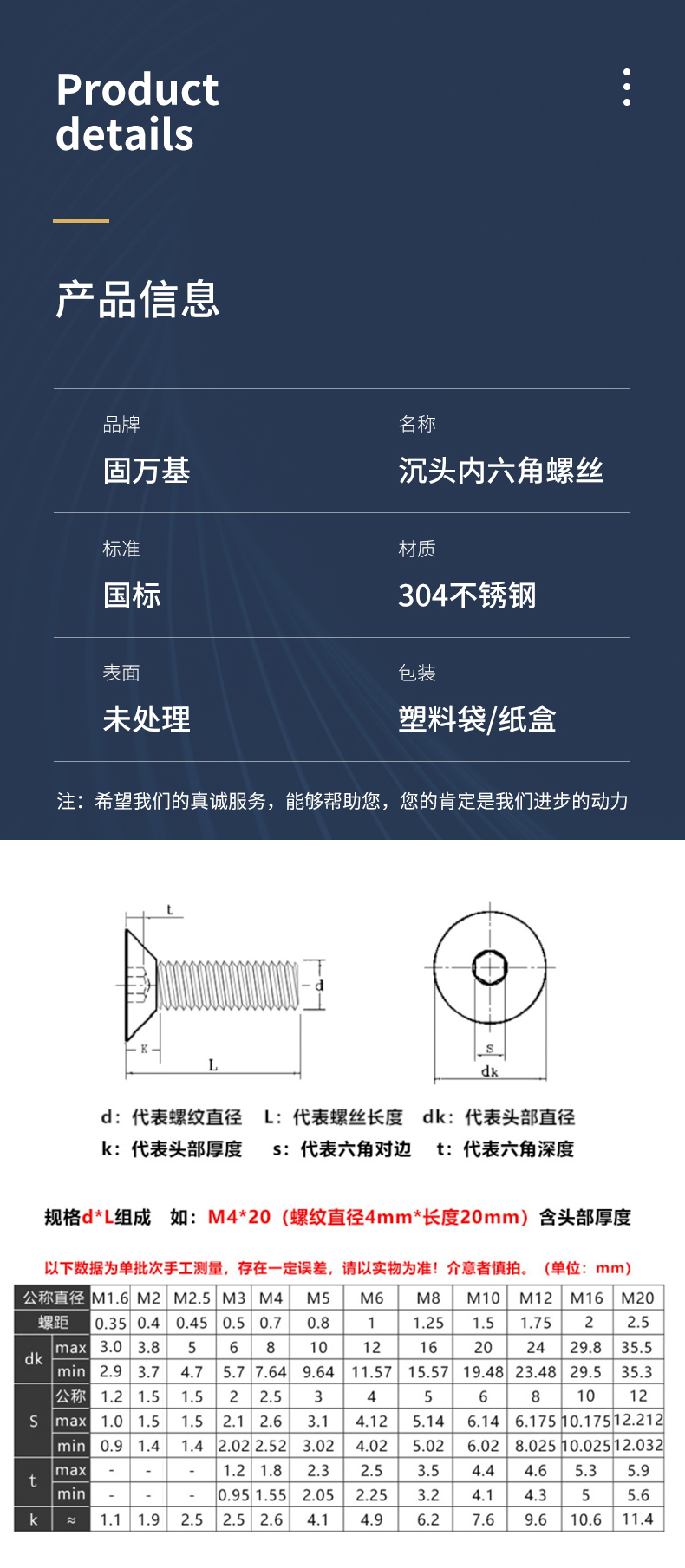 GUWANJI(固万基) 304不锈钢GB70.3沉头内六角螺丝螺栓平头平杯螺钉 M3x35 SZ117012